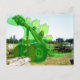 Ein fröhlicher, grüner Cartoon-Stegosaurus sitzend auf dem Boden, starrend auf den Himmel bis zum verlassen Rahmen überlagert über das Foto einer alten Maschine mit großen Rädern, bildet ein "Skelett" für den Dinosaurier.