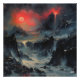 Ilustración que mezcla impresionismo y surrealismo, mostrando un paisaje cósmico con un planeta envuelto en llamas, mares turbulentos y formaciones rocosas que emergen del océano en un caos de fuego y piedra. Perfecto para los amantes del arte fantástico y del cosmos.