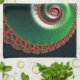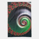 Diese Arbeit zeichnet sich durch ein komplexes, wirbelndes Fraktal mit einer Spiralstruktur aus, die sich unendlich nach innen ausdehnt. Die Primärfarben sind lebhaft rot und üppig grün, kontrastieren mit einem tiefen, dunklen Hintergrund. Entlang der Spirale wiederholen sich komplexe, kleinere Fraktal-Formen, die ein Gefühl von Tiefe und Bewegung schaffen. Die roten Fraktal-Elemente ähneln Bio Formen, fast wie blühende Blume oder geschwungene Blätter. Die grünen Töne wechseln allmählich zu silbrigen Weißen naher in die Mitte, wodurch ein leuchtender Effekt entsteht. Insgesamt ruft das Bild ein Gefühl unendlicher Komplexität und dynamischer Energie hervor.