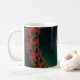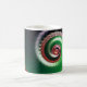 Diese Arbeit zeichnet sich durch ein komplexes, wirbelndes Fraktal mit einer Spiralstruktur aus, die sich unendlich nach innen ausdehnt. Die Primärfarben sind lebhaft rot und üppig grün, kontrastieren mit einem tiefen, dunklen Hintergrund. Entlang der Spirale wiederholen sich komplexe, kleinere Fraktal-Formen, die ein Gefühl von Tiefe und Bewegung schaffen. Die roten Fraktal-Elemente ähneln Bio Formen, fast wie blühende Blume oder geschwungene Blätter. Die grünen Töne wechseln allmählich zu silbrigen Weißen naher in die Mitte, wodurch ein leuchtender Effekt entsteht. Insgesamt ruft das Bild ein Gefühl unendlicher Komplexität und dynamischer Energie hervor.