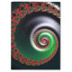Diese Arbeit zeichnet sich durch ein komplexes, wirbelndes Fraktal mit einer Spiralstruktur aus, die sich unendlich nach innen ausdehnt. Die Primärfarben sind lebhaft rot und üppig grün, kontrastieren mit einem tiefen, dunklen Hintergrund. Entlang der Spirale wiederholen sich komplexe, kleinere Fraktal-Formen, die ein Gefühl von Tiefe und Bewegung schaffen. Die roten Fraktal-Elemente ähneln Bio Formen, fast wie blühende Blume oder geschwungene Blätter. Die grünen Töne wechseln allmählich zu silbrigen Weißen naher in die Mitte, wodurch ein leuchtender Effekt entsteht. Insgesamt ruft das Bild ein Gefühl unendlicher Komplexität und dynamischer Energie hervor.