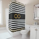 Chic Unendlichkeitssymbol und goldene metallische Konfetti auf schwarz-weiß gestreiften Duschvorhang.