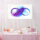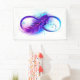 Infinity symbol with a beautiful feather painted in purple and blue bright colors on white background.
