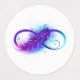 Infinity symbol with a beautiful feather painted in purple and blue bright colors on white background.