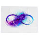 Infinity symbol with a beautiful feather painted in purple and blue bright colors on white background.