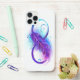 Infinity symbol with a beautiful feather painted in purple and blue bright colors on white background.