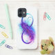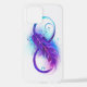 Infinity symbol with a beautiful feather painted in purple and blue bright colors on white background.