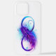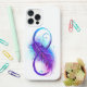Infinity symbol with a beautiful feather painted in purple and blue bright colors on white background.