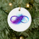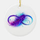 Infinity symbol with a beautiful feather painted in purple and blue bright colors on white background.