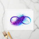 Infinity symbol with a beautiful feather painted in purple and blue bright colors on white background.