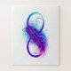 Infinity symbol with a beautiful feather painted in purple and blue bright colors on white background.