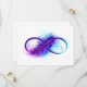 Infinity symbol with a beautiful feather painted in purple and blue bright colors on white background.