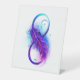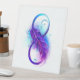 Infinity symbol with a beautiful feather painted in purple and blue bright colors on white background.