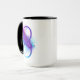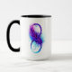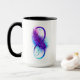 Infinity symbol with a beautiful feather painted in purple and blue bright colors on white background.