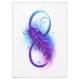 Infinity symbol with a beautiful feather painted in purple and blue bright colors on white background.
