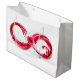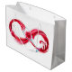Infinity symbol of continuous stream of red wine puring into glass wine glass on white background.