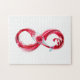 Infinity symbol of continuous stream of red wine puring into glass wine glass on white background.