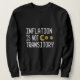 Phantastisches Bitcoin-Design mit einem Bitcoin-Monster, das Dollars und Euro isst, und dem Zitat "Inflation ist nicht vorübergehend".