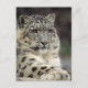 Nah-up Aufnahme eines Schneeleoparden mit Arteninformationen auf der Rückseite.