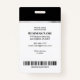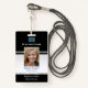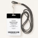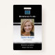 Ein Abzeichen in silberfarbenem und schwarzem Design mit Firmennamen, Foto, Name, Logo und All Info; sowie Platz für Bar und Zahlen.