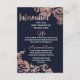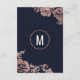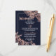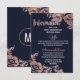 Elegante, schicke und schlichte moderne Imitate druckten Rose Gold-Blume und Typografie auf marineblau-marinebasischem Hintergrund, die Informationskarte für Hochzeiten. Dieses klassische und raffinierte Design eignet sich perfekt für den anspruchsvollen, stilvollen und trendigen Absolventen. Personalisieren Sie Ihre eigene Nachricht auf der Vorderseite und ein individuelles Monogramm auf der Rückseite. Das gesamte Foto-Druckdesign.