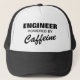 Ingenieur angetrieben durch Koffeinfernlastfahrerhut. Lustige Kappe für Kaffeeliebhaber, Süchtigen, Chef, Co-Arbeitskraft, Ehemann, Vati, Bruder, Großvater, Angestellten, Personal, Personal etc. Büro Humor für Männer und Frauen auf dem Job. Kundengerechtes Zitat für andere Berufe und Berufe. Kundenspezifische Headwear Geburtstagsgeschenkidee. Typografieschablonenentwurf.