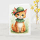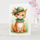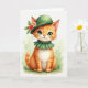 Dieses Design zeigt ein anthropomorphes Ingwerkätzchen, das in der Szene zentriert ist und mit leuchtend smaragdgrünen Augen direkt nach vorne schaut, die so wirken, als würden sie einen zarten Blick für jemanden Besonderes halten 💚. Es trägt einen waldgrünen Bowlerhut, der mit kleinen roten und pfirsichfarbenen Blumen dekoriert ist, die zwischen grünen Blättern versteckt sind und die Augenfarbe des Kätzchens widerspiegeln. Ein passender, geraffter Kragen umgibt seinen Hals und verleiht ihm ein herausgeputztes Aussehen, das wie ein freundliches Date oder ein süßes Treffen im Park wirkt. Das Fell ist orange-weiß mit weicher Streifenzeichnung, und die winzige rosa Nase und das schwache Lächeln verleihen ihm einen sanften, liebevollen Ausdruck. Der Hintergrund ist ein leichter, grüner Waschgang, der eine ruhige Wiese andeutet, mit einigen winzigen weißen Blüten und dünnen Grashalmen, die herum verstreut sind. Der St