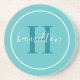Das elegante, runde, personalisierte Getränke-Untersetzer-Design zeichnet sich durch ein klassisches Serif-Monogramm aus, das in einer aquamarinen, grünen Farbe mit Ihrem Nachnamen in einem modernen, weißen Kalligrafieschrift vor einem aquablau gefärbten Hintergrund beginnt. Ein einfacher weißer Kreis umrahmt das Design. Das Farbschema kann so angepasst werden, dass es sich perfekt mit Ihrer Wohngestaltung abstimmt.