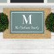 Schalten Sie Ihren Zuhause mit dieser eleganten, maßgeschneiderten monogramm-Doormat in grauem aquamarinem Blau / Grün und Weiß auf. Hinweis: Die Farben können geändert werden. Personalisieren Sie mit dem Nachnamen Ihrer Familie im Skript und einem Serifenstil Monogramm Initial. Das Design umfasst einen gerahmten Rahmen.