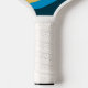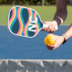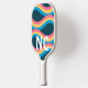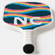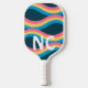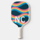 Retro-Wellen in lebhaftem Rosa, Gelb und Hellblau auf dunkelblauem Hintergrund. Ihre Initialen werden in Weiß- und Großformat nahe am Handle angezeigt. Viel Spaß beim nächsten Pickleball Spiel mit diesem fröhlichen und farbenfrohen Design!