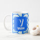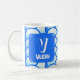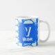 Diese Monogramm-Tasse ist eine großartige Möglichkeit, Ihrem Morgenalltag einen einzigartigen Akzent zu verleihen. Ein leuchtend blaues geometrisches Muster erscheint vor einem hellblauen Hintergrund. Der Buchstabe "V" wird zusammen mit dem Familiennamen in einem Quadrat dargestellt. Der Buchstabe und Ihr Name können schnell und einfach personalisiert werden. Original Design - C. McGouldrick