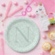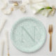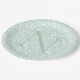 Hübsche pastellgrüne Damast Papier Teller. Damast Hintergrund mit Salbei grün und Monogramm.