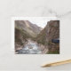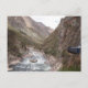 Postkarte des blauen Zuges der Inka-Bahn von Cusco nach Machu Picchu durch das Heilige Tal oder Urubamba Tal mit großen Bergen und Urubamba Fluss in Peru.