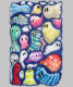 Eine Gruppe von skurrilen, bunten Geistern füllt den Raum, jede Figur ist einzigartig, mit verschiedenen Mustern und Farben, die einen spielerischen und lebendigen Kontrast bieten. Der Gesamteindruck ist lebendig und einfallsreich, was ein Gefühl von Spaß und Rätsel hervorruft.
