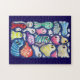 Eine Gruppe von skurrilen, bunten Geistern füllt den Raum, jede Figur ist einzigartig, mit verschiedenen Mustern und Farben, die einen spielerischen und lebendigen Kontrast bieten. Der Gesamteindruck ist lebendig und einfallsreich, was ein Gefühl von Spaß und Rätsel hervorruft.
