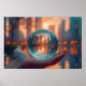 Kristallkulisse in der Hand, die das Ausblick auf die Stadt und die Skyline bei Sonnenuntergang mit dem gleichen panoramischen Hintergrund widerspiegelt