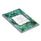Ein Notizbuch mit einem klugen, inspirierenden motivierend Zitat, das besagt: Jeder Akt der Freundlichkeit wächst den Geist und stärkt das Soul. Set auf einem grungenhaften Rahmen. Der Hintergrund ist ein Muster von Pfauenfedern. Farbenvolles Design in aquamarin, Juwelengrün, Aquablau und Kobalt.