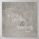 Ein inspirierendes Gandhi Zitat-Poster hat ein gemaltes, bedrücktes graues Hintergrunddesign mit weißem Text, wahrheitsgetreu, sanft und furchtlos für die Wandkunst-Dekoration in Zuhause oder Büro.