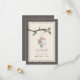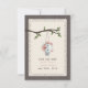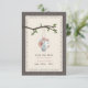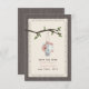 Eine Hochzeit im Freien speichern Sie das Datum mit einer Abbildung einer Zinn gefüllt mit Pfirsich und blauen Gänseblümchen, die von einem Baumzweig mit grünen Blätter hängen. Vorder und hinten ist Holz inspiriert.