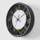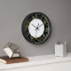 Diese Wanduhr besteht aus Teilen einer gedruckten integrierten Schalttafel mit elektronischen Bauteilen, vorwiegend Widerstände und Kondensatoren, die auf der Oberfläche mit anderen Bauteilen hellgelb beschriftet sind und einen schwarzen Hintergrund hinter und um die Uhr herum bilden. Es gibt Platz in der Mitte für Ihren Namen oder Ihre Nachricht.