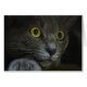 Eine nah-up-Aufnahme des Gesichts einer grauen Katze mit gelben Augen und verdünnten Schülern, die den Kopf auf der Pfote ruht und etwas hinter der Kamera scharf starrt.