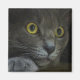 Eine nah-up-Aufnahme des Gesichts einer grauen Katze mit gelben Augen und verdünnten Schülern, die den Kopf auf der Pfote ruht und etwas hinter der Kamera scharf starrt.