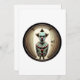 Farbenfrohe, traurige Punk Clown stehend in einer engen Tür, Blick direkt auf den Betrachter. Der Clown hat scharf nach oben gestylte Haare, eine rote Nase und ein klassisches Clownkostüm mit roten Details. Sein Ausdruck ist intensiv und schafft ein etwas beunruhigendes, aber dynamisches Design. Der Hintergrund ist minimalistisch und betont den Power des Clowns.