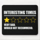 Interesting Times - Very Bad. Would Not Recommend. This sarcastic funny quote accessory is great for men & women who would give this decade a one star rating. Face difficult times with humor and sarcasm. A Chinese curse states, "May You Live In Interesting Times", and many would agree this time in history fits this description. With war, political polarization and climate change, these are challenging times indeed!