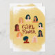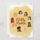 Schöne multikulturelle internationale Frauentage Grußkarte. Das Design zeigt weibliche Gesichter mit ockerfarbenem Hintergrund und den ermutigenden Text Girl Power in passender Braun. Die Rückseite weist den gleichen ockerfarbenen Hintergrund mit einem kleinen braunen Herz auf. Schicken Sie diese einmalige Karte auf dem 8. März und stärken Sie Frauen.