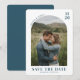 This wedding save the date card features a serene, pastoral design with a central rectangular photo placeholder showcasing two people embracing in a field of tall grasses. The layout is vertically oriented with ample negative space, creating a clean and balanced composition. The color palette includes muted greens, soft blues, and neutral grays, evoking a tranquil countryside atmosphere. Elegant serif typography highlights the names at the top and "SAVE THE DATE" at the bottom, while smaller italicized text indicates the location. The overall mood is warm and intimate, perfect for celebrating a personal and heartfelt occasion.
