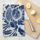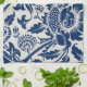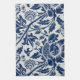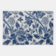 Intricate blue floral pattern on a light background, featuring stylized blooms and curling leaves, evoking a vintage, elegant feel.
