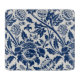 Intricate blue floral pattern on a light background, featuring stylized blooms and curling leaves, evoking a vintage, elegant feel.