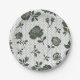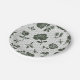 Round plate with intricate dark floral patterns on a light background. The design has roses and leaves with a subtle honeycomb texture, viewed from top and angled sides.