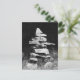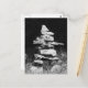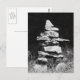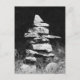 Eine auffallende Schwarz-Weiß-Fotografie eines Felseninukshuks, die in historischen Zeiten als Richtungszeichen verwendet wird, heute aber auf Straßen und Parks häufig zu sehen ist.